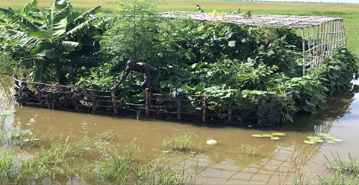 A soil layer is developed in the form of a bed elevated with fertile organic and fish waste products, accompanied by mulching to increase moisture in the beds. With that, soil fertility is enhanced by the organic waste products mixed with local green vegetation, such as dry grasses, animal waste for manure, and mud. The heap is then fenced with timber poles and bamboo sticks to protect the garden from wind, pests, and erosion in case the water levels rise.