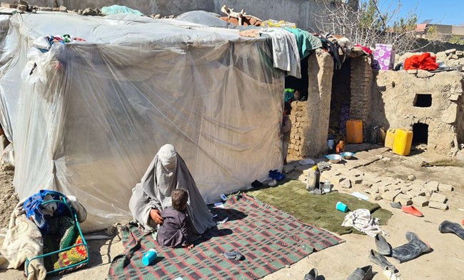 For 2,000 Afghani a month, around USD 21, she rented a small space as their interim home in Kandahar city. It was a makeshift shelter without proper walls, windows, a door, or even a roof over their heads. This was all she could afford, but like many vulnerable people, displaced and on the move and caught in poverty, the family had no choice than to accept the interim living conditions, which left the mother worried about the safety and survival of her children.